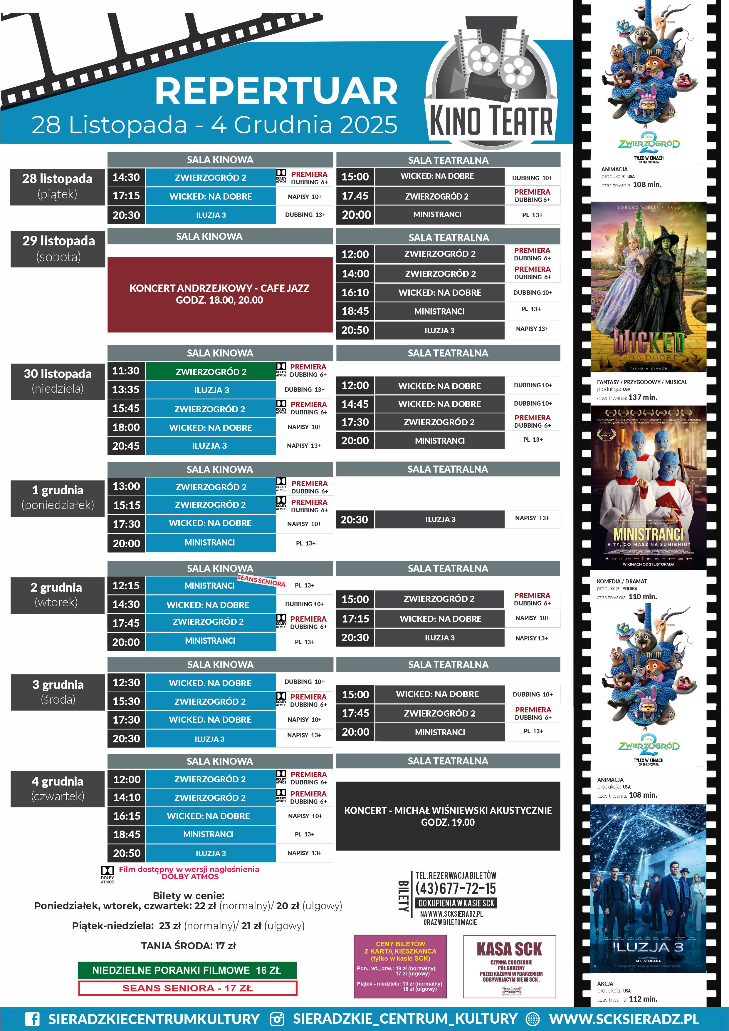Bilety dostępne w kasie SCK oraz na www.scksieradz.pl, a także w BILETOMACIE (przy SALI KINOWEJ).