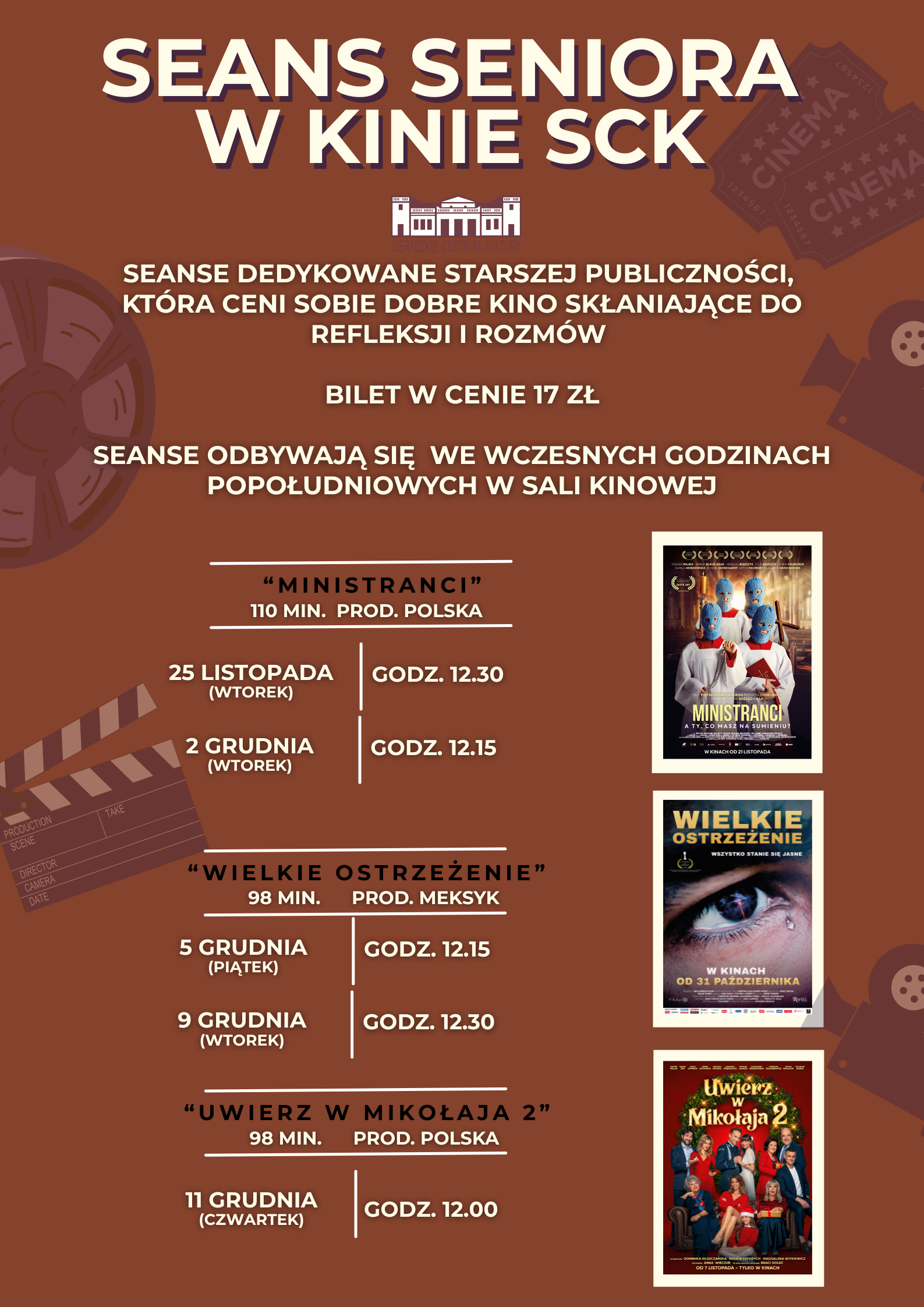 Cykl „Seans Seniora” to seanse dedykowane starszej publiczności, która ceni sobie dobre kino skłaniające do refleksji i rozmów. Celem jest również umożliwienie seniorom aktywnego uczestnictwa w kulturze i spędzenia wolnego czasu w ciekawy sposób.