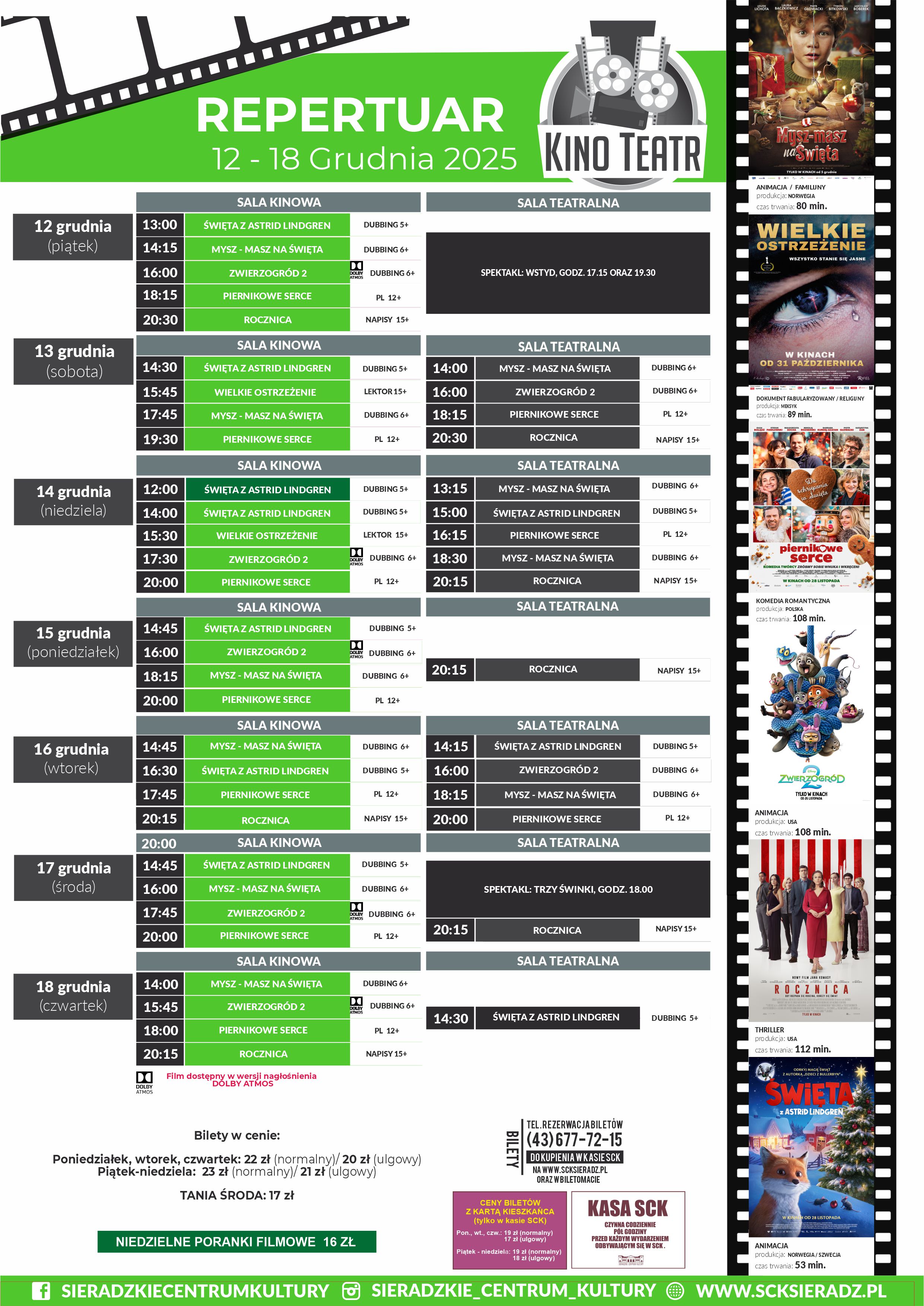Bilety dostępne w kasie SCK oraz na www.scksieradz.pl, a także w BILETOMACIE (przy SALI KINOWEJ).