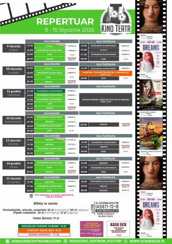 REPERTUAR KINOWY KINO-TEATR SCK SIERADZ 9 STYCZNIA 2026 (piątek) 13.00 - SPONGEBOB / DUBBING; 6+ / SALA TEATRALNA 13.30 - SEANS SENIORA: NIEDZIELE  / LEKTOR; 12+ / SALA KINOWA 15.00 - NIEDZIELE  / LEKTOR; 12+ / SALA TEATRALNA 16.00 - SPONGEBOB  / DUBBING; 6+ / SALA KINOWA 17.30 - SPONGEBOB  / DUBBING; 6+ / SALA TEATRALNA 18.00 - DZIKI / PL; 15+ / SALA KINOWA 20.00 - DZIKI / PL; 15+ / SALA TEATRALNA 20.45 - DREAMS  / PREMIERA  / NAPISY 15+ / SALA KINOWA POBIERZ REPERTUAR PDF    Bilety dostępne w kasie SCK oraz na www.scksieradz.pl, a także w BILETOMACIE (przy SALI KINOWEJ).