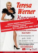 Z powodu nagłej infekcji grypowej Artystki koncert Teresy Werner, który miał odbyć się 22.02.2026 r., zostaje przeniesiony na 9.04.2026 r. na godz. 18.00