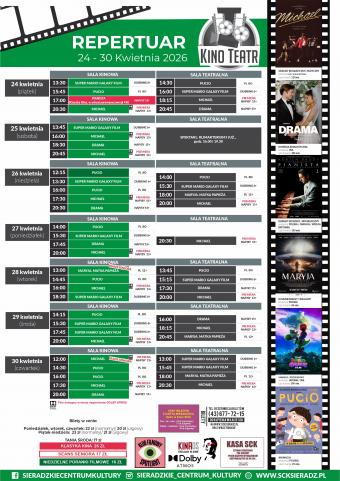 REPERTUAR KINOWY KINO-TEATR SCK SIERADZ 21 KWIETNIA 2026 (wtorek) 13.30 - PUCIO / PREMIERA / DUBBING  PL BO / SALA KINOWA 15.00 - PUCIO / PREMIERA / DUBBING  PL BO / SALA KINOWA 16.15 - SUPER MARIO GALAXY FILM / DUBBING  6+ / SALA KINOWA 18.30 - SUPER MARIO GALAXY FILM / DUBBING  6+ / SALA KINOWA 20.45 - ZABAWA W POCHOWANEGO 2 / DOLBY ATMOS  / NAPISY   15+/ SALA KINOWA   POBIERZ REPERTUAR PDF    Bilety dostępne w kasie SCK oraz na www.scksieradz.pl, a także w BILETOMACIE (przy SALI KINOWEJ).