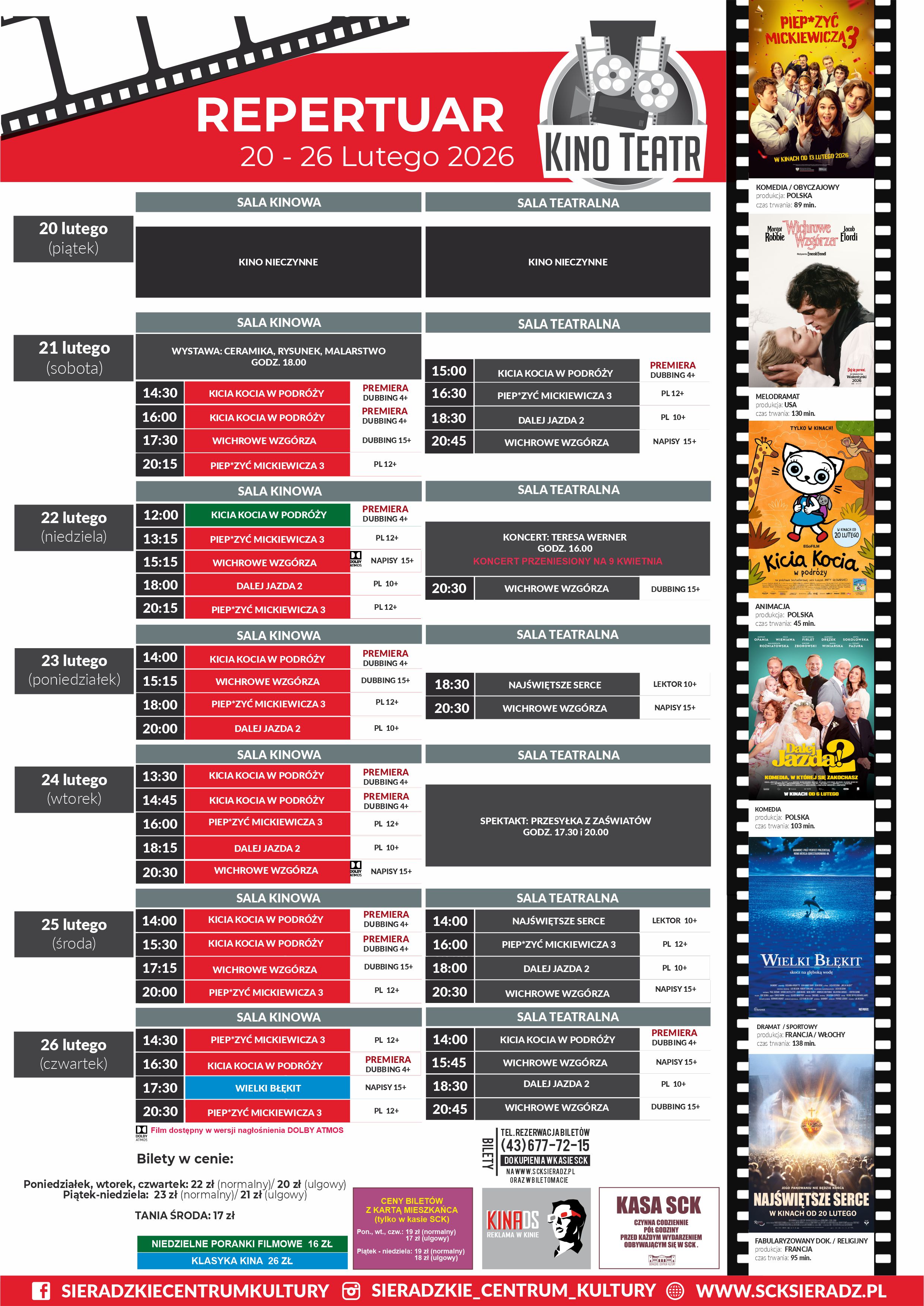 Bilety dostępne w kasie SCK oraz na www.scksieradz.pl, a także w BILETOMACIE (przy SALI KINOWEJ).