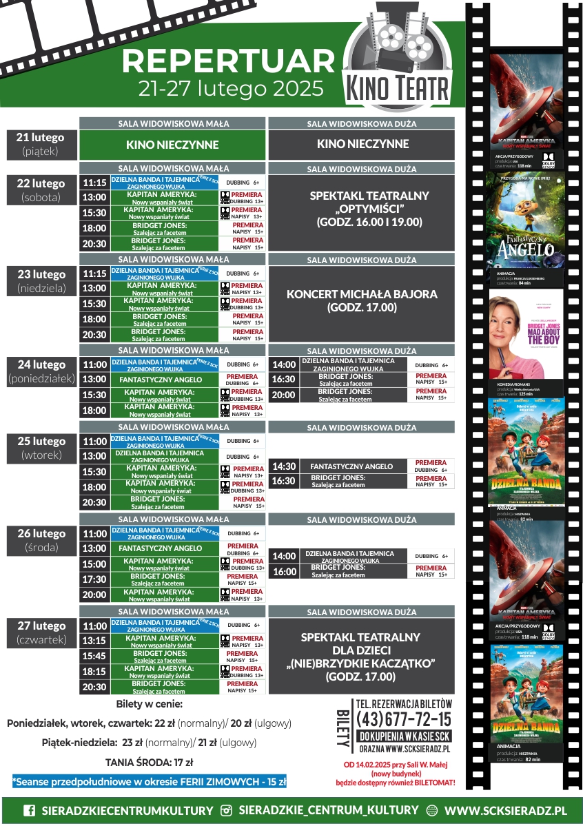 Bilety dostępne w kasie SCK oraz na www.scksieradz.pl. KASA czynna od środy do piątku w godzinach 14:00-19:00, oraz na godzinę przed każdym wydarzeniem odbywającym się w SCK tel. (43) 677-72-15.