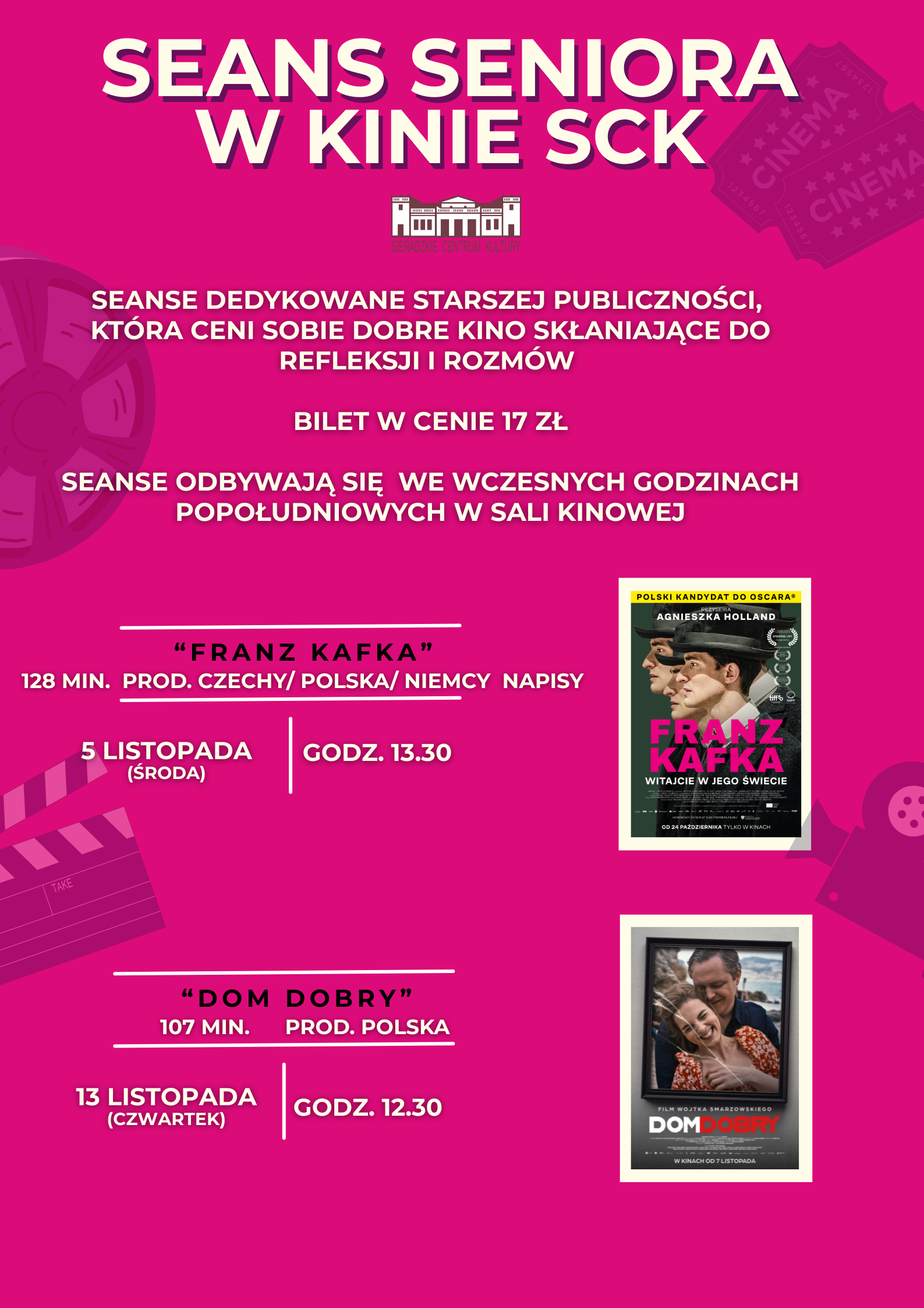 Cykl „Seans Seniora” to seanse dedykowane starszej publiczności, która ceni sobie dobre kino skłaniające do refleksji i rozmów. Celem jest również umożliwienie seniorom aktywnego uczestnictwa w kulturze i spędzenia wolnego czasu w ciekawy sposób.