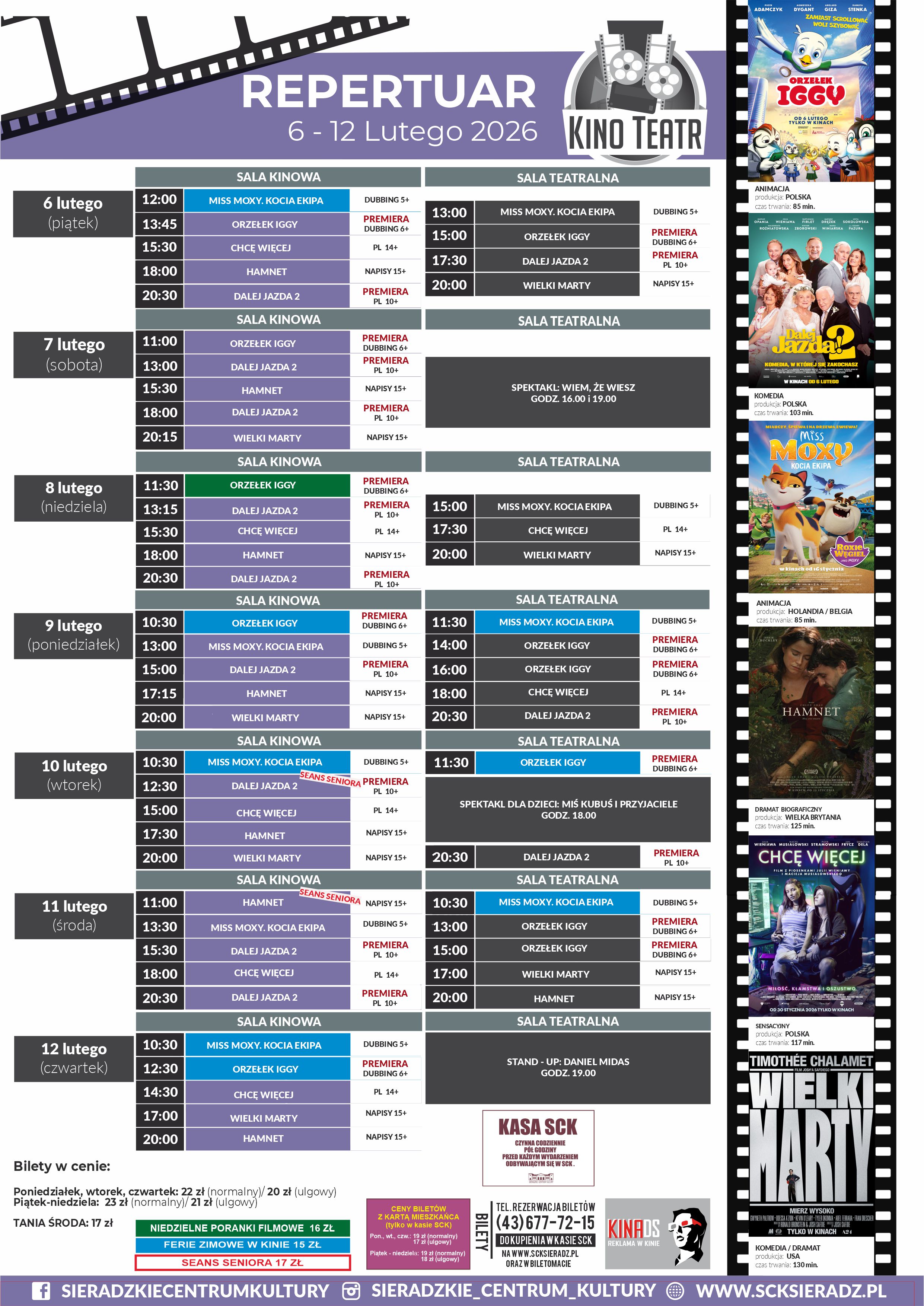 Bilety dostępne w kasie SCK oraz na www.scksieradz.pl, a także w BILETOMACIE (przy SALI KINOWEJ).