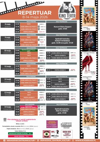 REPERTUAR KINOWY KINO-TEATR SCK SIERADZ 1 MAJA 2026 (piątek) 14.00 - ARCO / DUBBING  8+ /SALA TEATRALNA 15.00 - DIABEŁ UBIERA SIĘ U PRADY 2 / PREMIERA / DOLBY ATMOS / NAPISY 13+/ SALA KINOWA 16.00 - ARCO / DUBBING  8+ / SALA TEATRALNA 17.30 - MICHAEL / DOLBY ATMOS / NAPISY  13+/ SALA KINOWA 18.00 - DIABEŁ UBIERA SIĘ U PRADY 2 / PREMIERA / NAPISY 13+/ SALA TEATRALNA 20.00 - DIABEŁ UBIERA SIĘ U PRADY 2 / PREMIERA / DOLBY ATMOS / NAPISY 13+/ SALA KINOWA 20.30 - MICHAEL / NAPISY  13+/ SALA TEATRALNA   POBIERZ REPERTUAR PDF    Bilety dostępne w kasie SCK oraz na www.scksieradz.pl, a także w BILETOMACIE (przy SALI KINOWEJ).